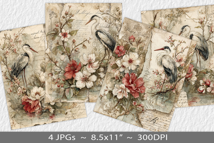Ephemera Digital Paper Scrapbook Paper Stork Junk Journal Distressed Grunge Letter Size Paper Junk Journal Background Vintage Paper Collage Floral Bird Collage