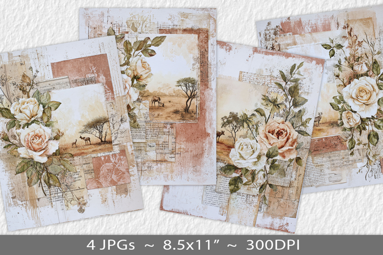 Ephemera Collage Digital Paper Scrapbook Paper Junk Journal Distressed Grunge Letter Size Paper Junk Journal Background Vintage Paper Collage Desert Roses
