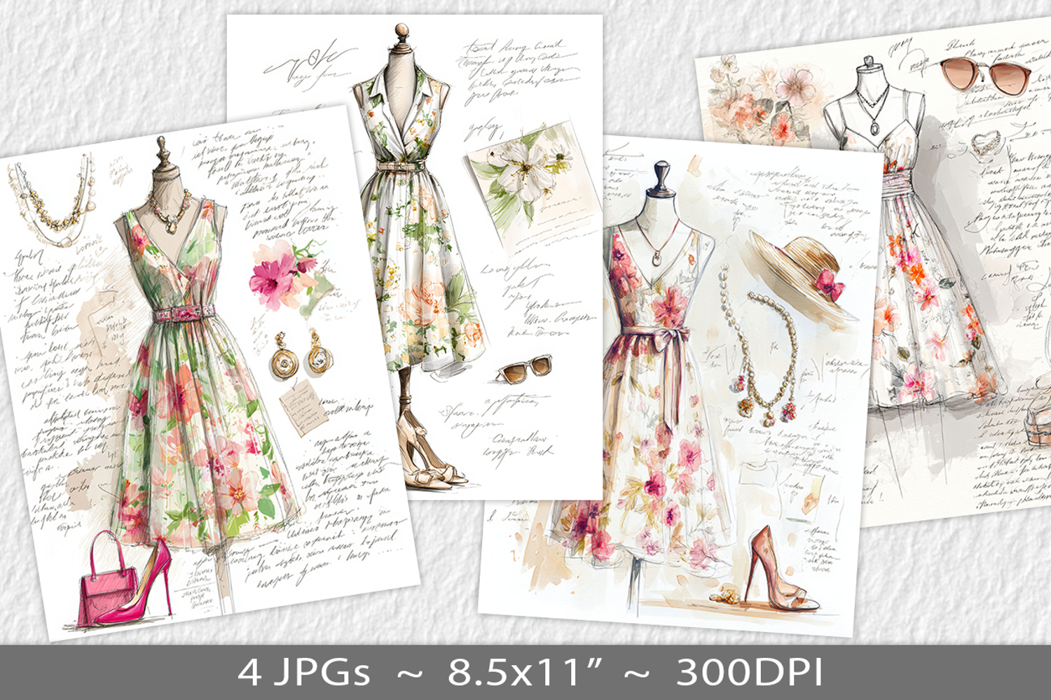 Digital Paper Scrapbook Paper Junk Journal Fashion Illustration Summer Dress Floral Dress Letter Size Paper Collage Ephemera Junk Journal Background Vintage Paper Collage