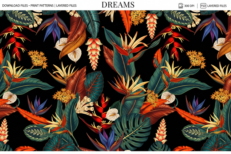 and tropical foliage in a richly detailed, print-ready repeat design.