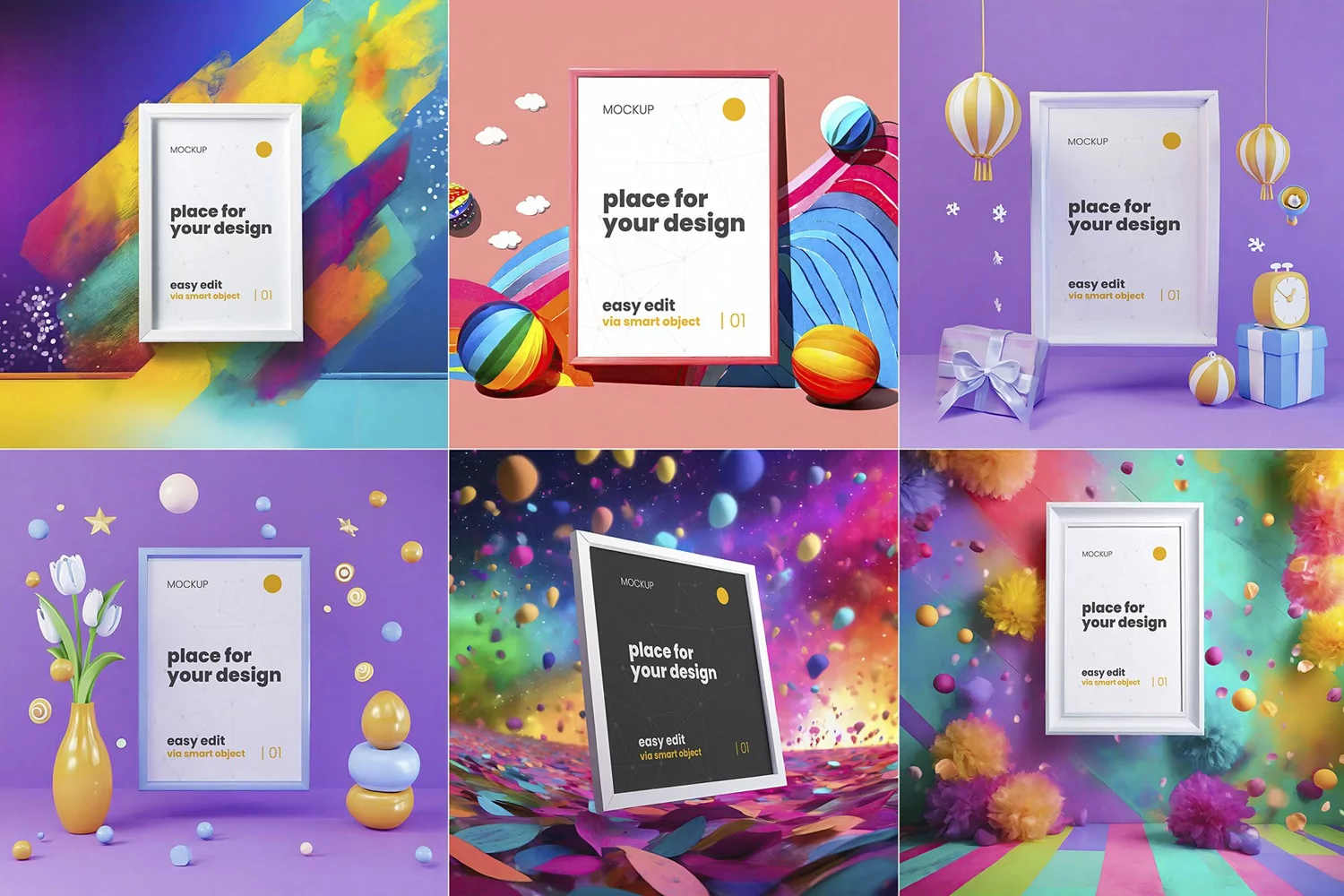 Save time and make your image (photo, poster, etc) look great with this amazing colorful mock-ups. Easy to replace posters with your designs using smart objects, double-click the Smart Layer, copy and paste your artwork, save and you’re done!