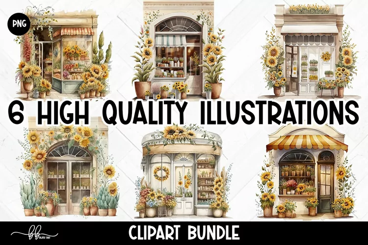 Sunflower Shop Watercolor Clipart Illustration Bundle