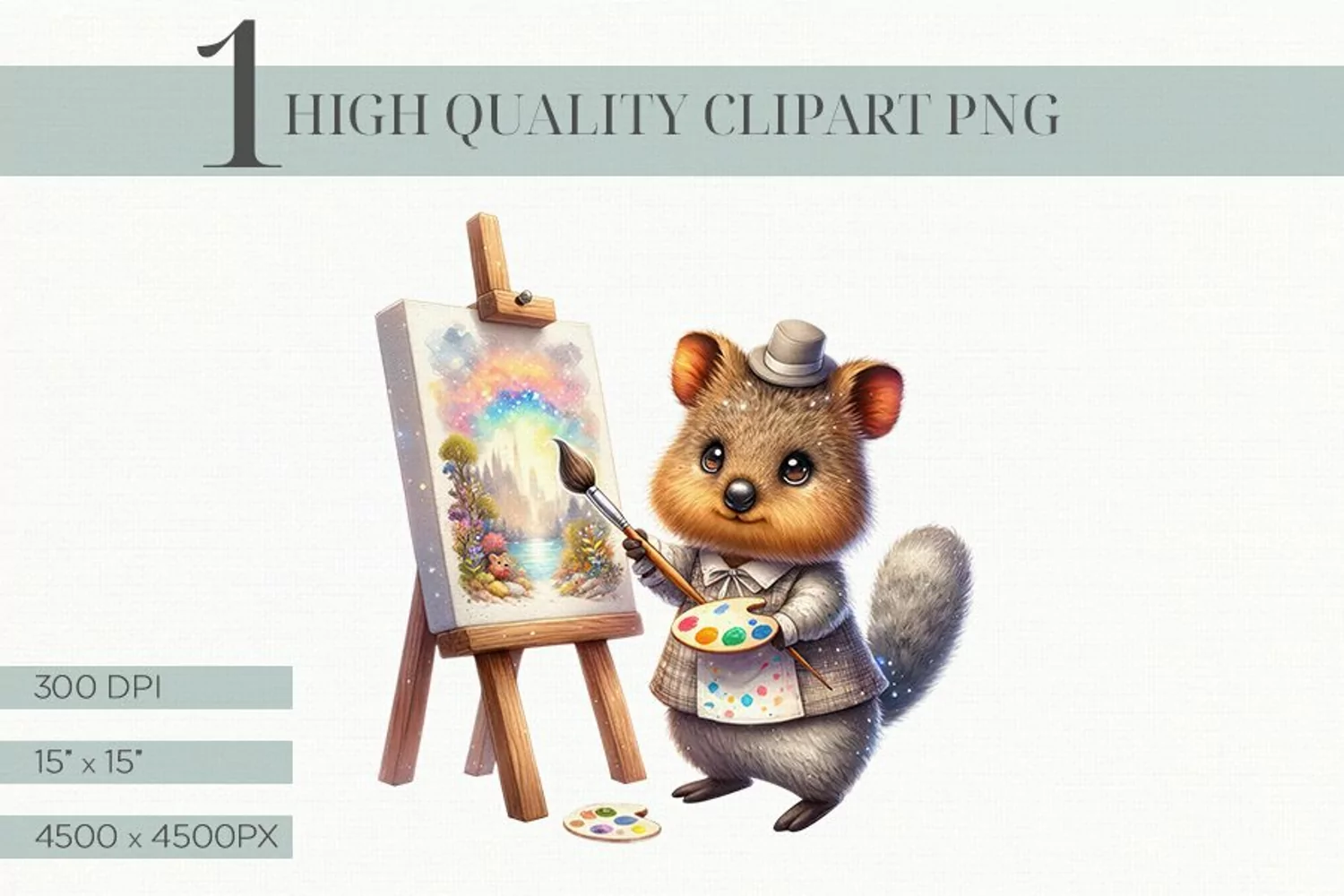 Step into the adorable world of quokkas with this high-quality artist quokka clipart! Perfect for adding a touch of whimsy to your digital projects, this digital PNG clipart features a cute quokka adorning a painter's outfit, ready to create some magic. With a 300 DPI resolution and measuring 15" x 15", it's ideal for printing or digital work. Whether you're designing party invitations, greeting cards, or enhancing your blog post, this lovable clipart is sure to spark joy and creativity. Instantly download and begin using in your projects without any fuss!