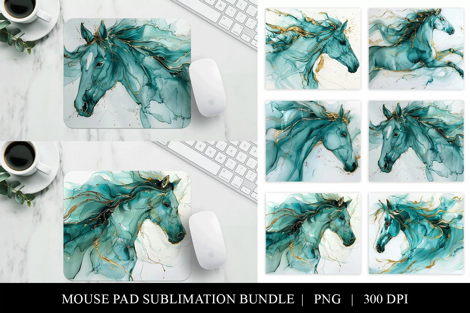 Elevate your workspace with this exquisite abstract horse art mouse pad design bundle. Instantly downloadable in high-resolution PNG format at 300 DPI, this digital set features a stunning turquoise and gold palette that beautifully captures the majestic movement of horses. Perfect for home use or as a unique gift, this bundle ensures an artistic touch to any desk space.
