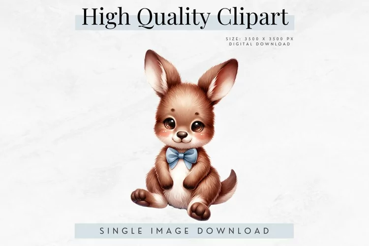Delight in this adorable high-quality digital kangaroo clipart featuring a charming cartoon kangaroo dressed with a cute blue bow. Perfect for a range of creative projects such as kids' party invitations, educational materials, nursery decorations, or digital artwork. This high-resolution image ensures that your projects look sharp and appealing at any size. Easy to download and use in a variety of digital formats, this clipart is ideal for designers, teachers, and crafters looking for cute animal illustrations.