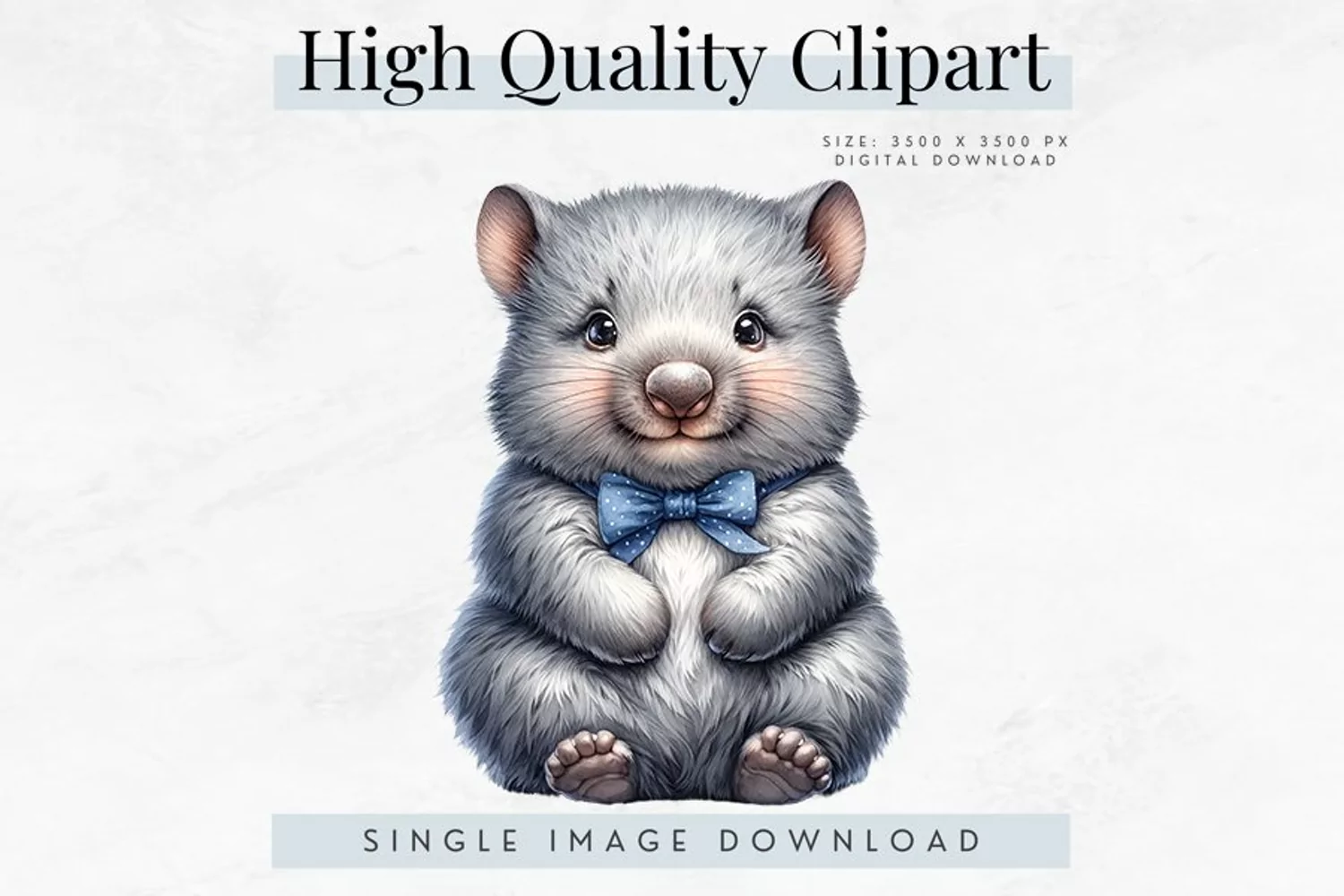 Add a touch of wildlife charm to your digital projects with this adorable high-resolution wombat clipart. This cute digital download features a whimsical wombat wearing a charming blue bow tie, rendered in stunning detail and perfect for a variety of uses such as crafts, illustrations, graphic designs, and educational materials. The image is available in a single download of 3500 x 3500 pixels, ensuring it is suitable for all your projects.
