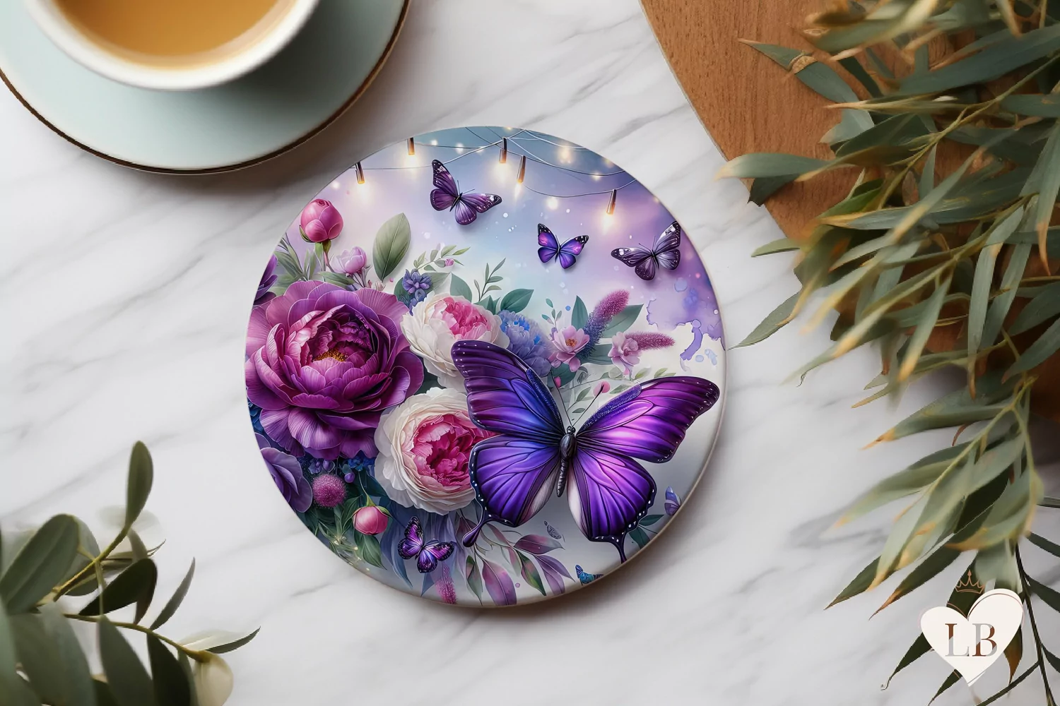 Illuminate your sublimation projects with this enchanting butterfly round coaster design. Featuring a mesmerizing purple butterfly amidst a lush bouquet of vibrant peonies and delicate florals, this artwork brings together elegance and a touch of magic. The soft, glowing lights and rich purples create a captivating atmosphere, perfect for sublimation or as a waterslide image. Ideal for crafting coasters or decor items that will bring a sense of wonder and beauty to any space.