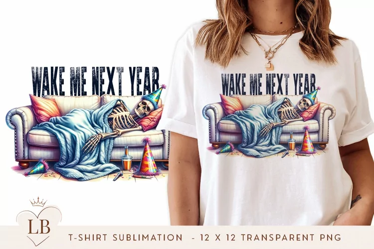 T-shirt Sublimation Png Humorous Holiday Design Wake Me Next Year Sublimation Snarky Skeleton Design Funny Party Hangover Art Skeleton On Couch Design 12x12 Transparent Png Seamless T-shirt Sublimation Funny Skeleton Shirt Design Party-themed Sublimation Art