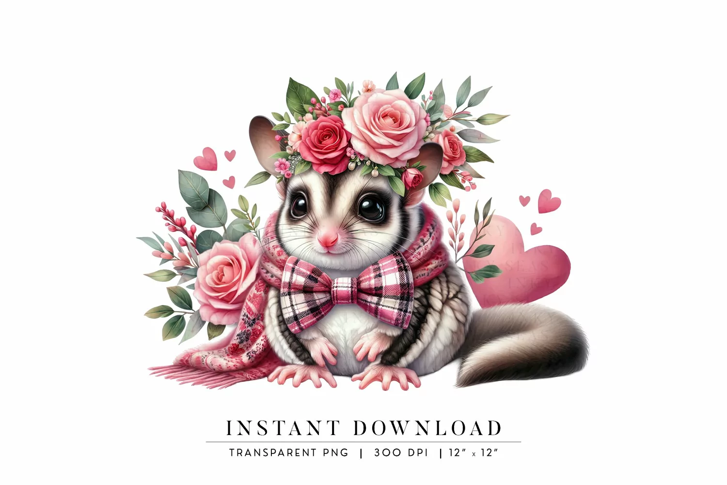 Bring charm to your crafts with this adorable sugar glider clipart featuring a delicate floral crown and plaid bowtie! This high-resolution 300 DPI PNG file with a transparent background is perfect for a variety of creative projects, including scrapbooking, greeting cards, sublimation, and more. Sized at 12"x12", it’s versatile for both small and large designs.