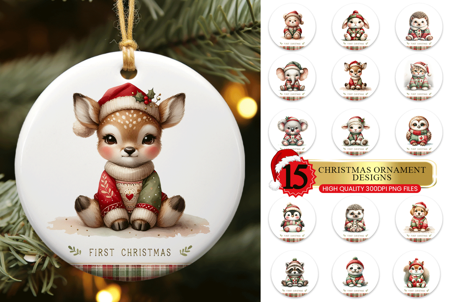 Digital Download Ornament Designs Sublimation Png Holiday Crafting Baby Animal Bundle Cute Baby Deer First Christmas Set Christmas Keepsake Newborn Ornament 15 File Bundle
