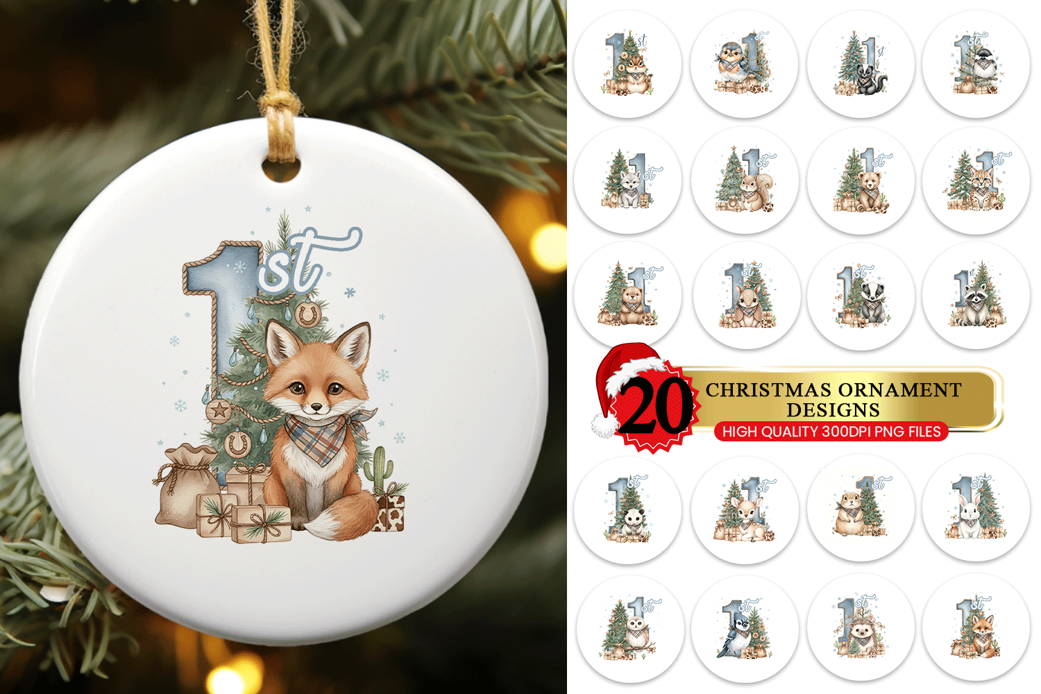 Create treasured keepsakes with this adorable 20-piece 1st Christmas Ornament Design Bundle, a high-quality collection of printable circle graphics perfect for sublimation crafters and businesses. This digital PNG file set features charming baby woodland animals like a fox, rabbit, and raccoon, wearing plaid scarves and bandanas next to a Christmas tree with the number "1st," all rendered in a soft, rustic watercolor aesthetic. Optimized at 300 DPI, these versatile designs are perfectly sized for round ornament blanks, making it easy to produce best-selling, Western-themed personalized gifts for a baby's first Christmas or cozy ranch decor.