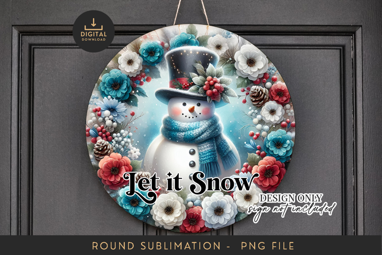 Elevate your collection of printable graphics with this exquisite Round Snowman Sublimation PNG, designed specifically for creating high-end winter and holiday signs. This gorgeous illustration centers on a happy Snowman wearing a classy top hat and scarf, surrounded by a strikingly colored floral border featuring deep teal, crimson, and snowy white blooms with pinecone accents. The elegant "Jet it Snow" text makes it versatile for use throughout the winter season. This high-resolution, easy-to-resize file ensures superior color and detail when applied to any round blank, making it an invaluable seasonal resource for creative projects.