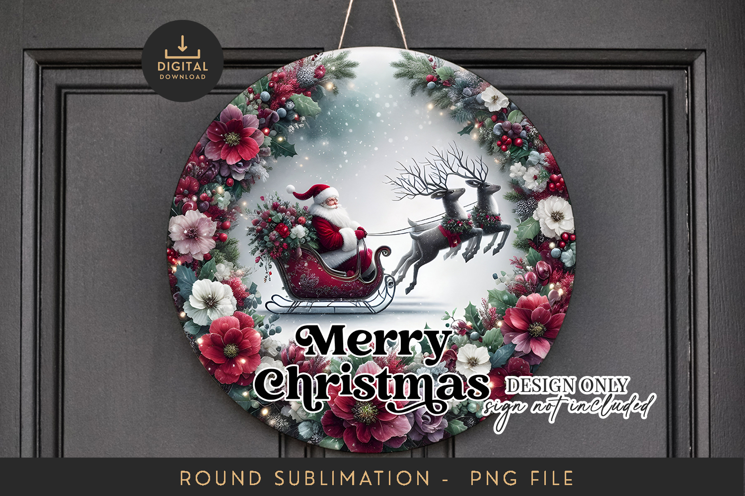 Acquire this exquisite and dramatic graphic asset: the Round Santa Sleigh Sublimation PNG, designed for creating premium holiday décor. This luxurious illustration captures a classic scene of Santa Claus and his flying reindeer, dramatically framed by a dense, beautiful floral wreath in a deep, sophisticated color palette. The striking "Merry Christmas" message complements the artwork perfectly. This high-resolution, easy-to-resize file ensures superior detail and deep color saturation when applied to any circular blank, making it an essential seasonal resource for creators looking to offer bold, high-quality Christmas signs and wall art.