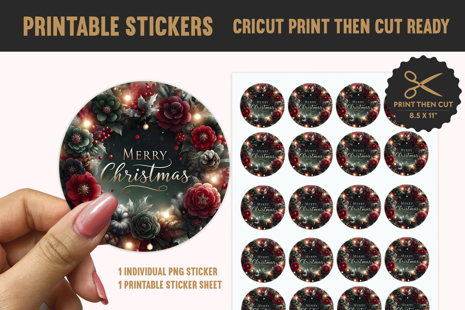 Acquire a sophisticated and high-demand graphic asset: the Moody Floral Christmas Printable Sticker PNG. This file features a richly detailed, dramatic wreath illustration with deep burgundy flowers, dark foliage, and sparkling holiday lights, centered around the beautiful phrase, "Merry Christmas". Your download includes one large individual PNG and one pre-arranged 8.5" x 11" printable sheet, already optimized to be Cricut Print Then Cut Ready. This high-resolution, versatile sticker art allows creators to effortlessly produce elegant and luxurious holiday packaging, seals, and embellishments that stand out in the crowded seasonal market.