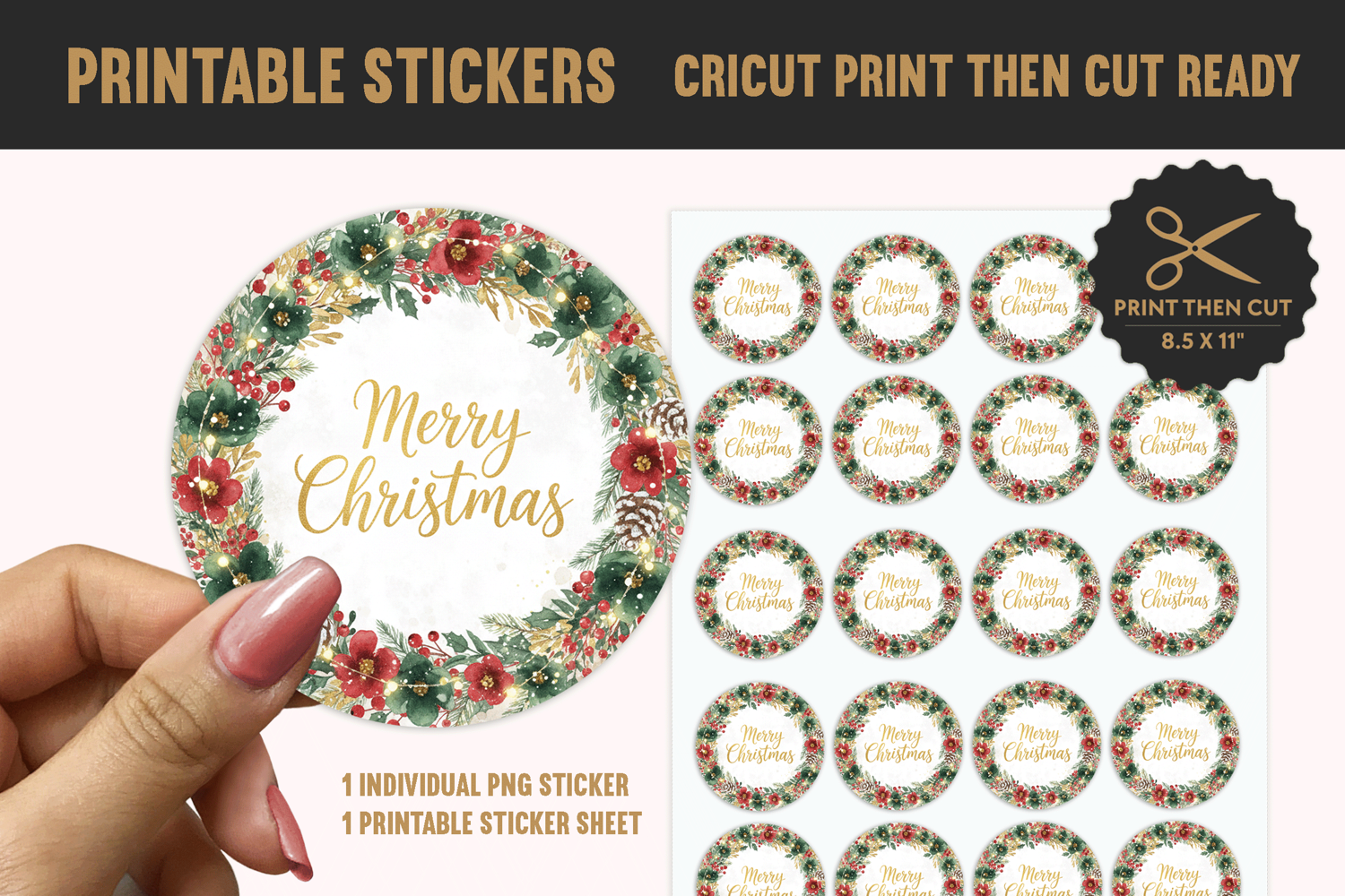 Acquire a classic and highly functional graphic asset: the Watercolor Floral "Merry Christmas" Printable Sticker PNG. This file features a hand-painted style wreath illustration with classic red and green florals, pinecones, and delicate foliage, beautifully framing the timeless phrase, "Merry Christmas". Your download includes one large individual PNG and one pre-arranged 8.5" x 11" printable sheet, perfectly prepared to be Cricut Print Then Cut Ready. This high-resolution sticker art allows creators to effortlessly produce elegant, beautiful, and professional-quality labels, seals, and embellishments for all their holiday products and crafts.