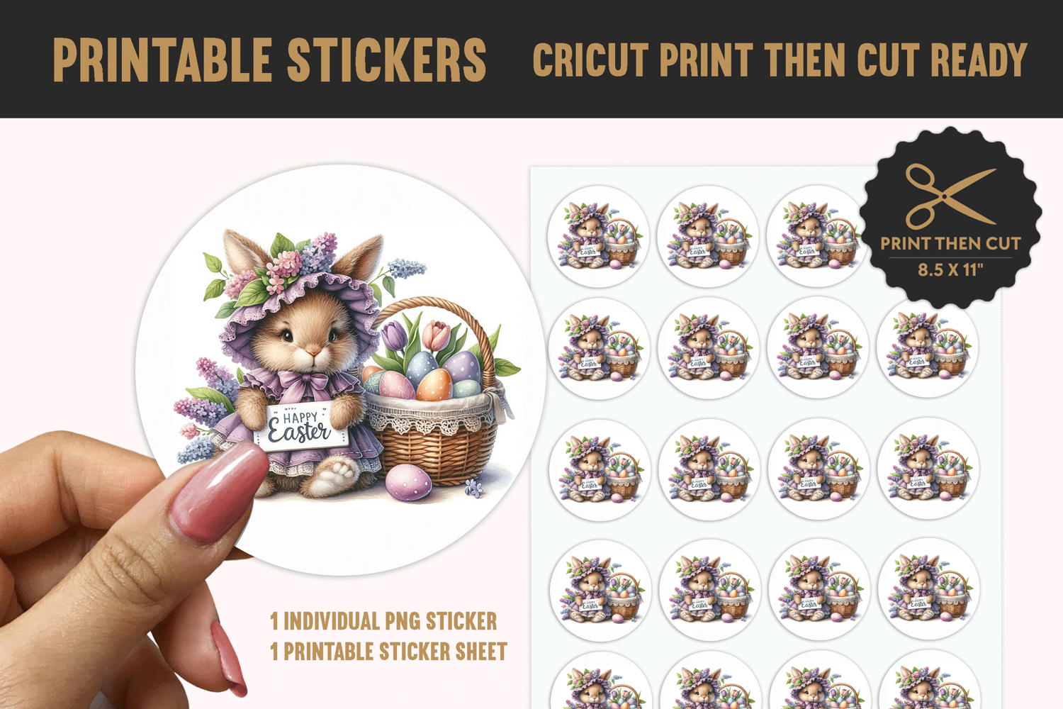 Acquire this charming and versatile graphic asset: the Easter Bunny Printable Sticker PNG. This file features a beautiful watercolor illustration of an adorable baby rabbit in a bonnet, surrounded by lilac flowers and a basket filled with pastel Easter eggs, embodying the joy of spring. Your download includes one large individual PNG and one pre-arranged 8.5" x 11" printable sheet, expertly prepared to be Cricut Print Then Cut Ready. This high-resolution sticker art allows creators to effortlessly produce elegant, high-quality labels, seals, and embellishments ideal for Easter packaging, spring scrapbooking, and personalized holiday favors.
