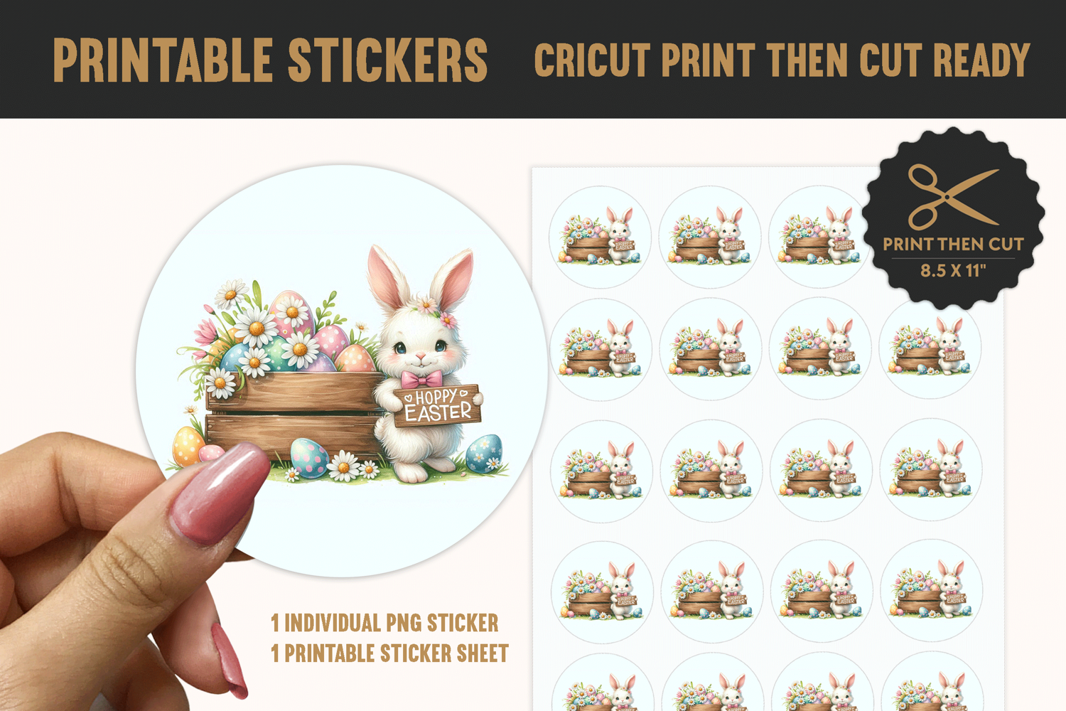 Acquire this charming and versatile graphic asset: the Easter Bunny Printable Sticker PNG. This file features a sweet watercolor illustration of an adorable baby rabbit holding an "Hoppy Easter" sign, nestled by a wooden crate full of daisies and pastel Easter eggs. Your download includes one large individual PNG and one pre-arranged 8.5" x 11" printable sheet, expertly prepared to be Cricut Print Then Cut Ready. This high-resolution sticker art allows creators to effortlessly produce charming, high-quality labels, seals, and embellishments ideal for Easter packaging, spring scrapbooking, and personalized holiday favors.