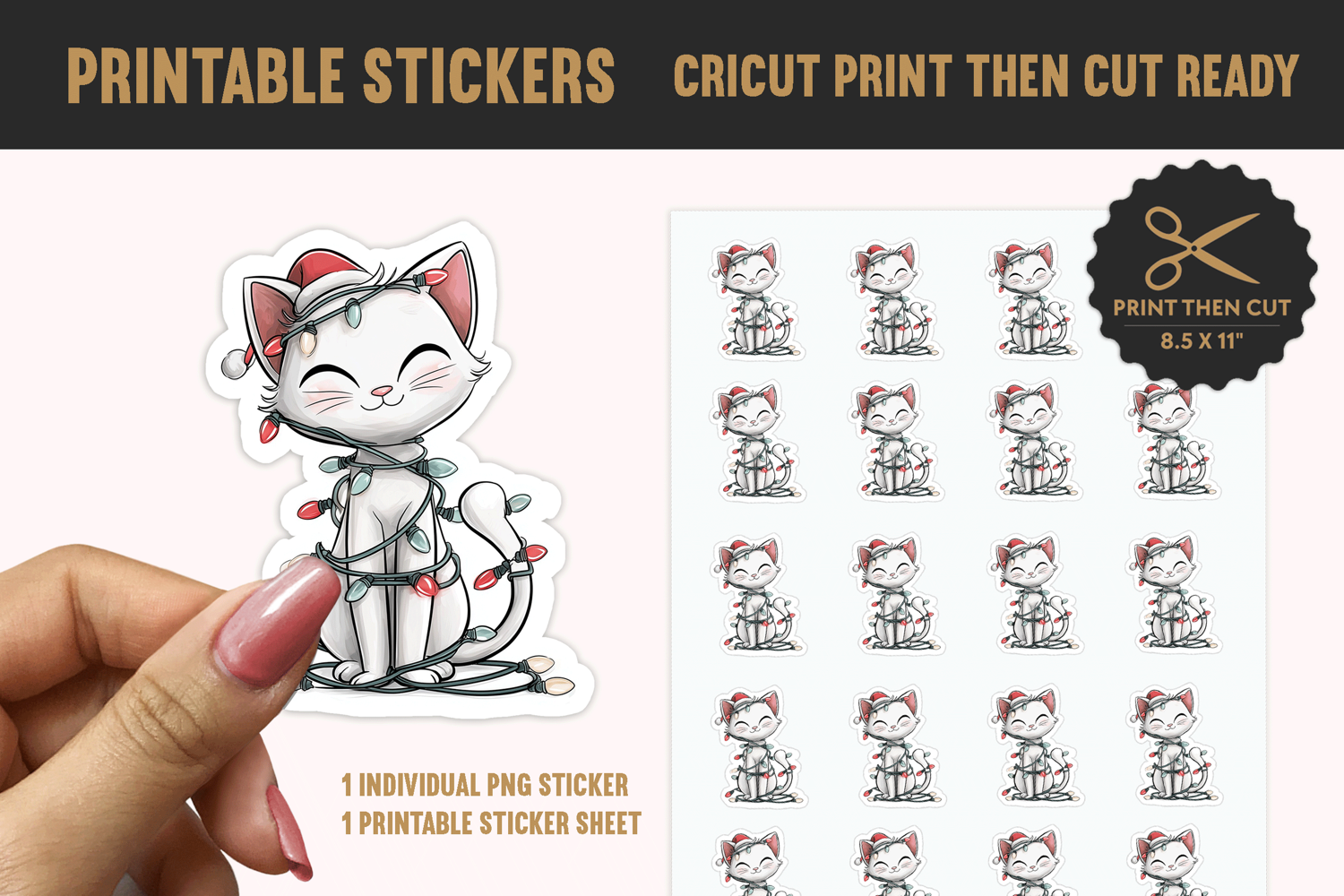 Add an irresistibly cute and festive touch to your holiday packaging, planner, or gifts with this delightful printable sticker set! It features a sweet cartoon white cat wearing a Santa hat and playfully tangled in colorful Christmas lights. This digital download includes one individual PNG sticker and one 8.5" x 11" sheet, perfectly configured to be Cricut Print Then Cut Ready. These high-quality files are easy to print and use, making it simple for you to create unique, adorable, and professional-quality labels perfect for cat lovers and anyone who enjoys whimsical holiday cheer.