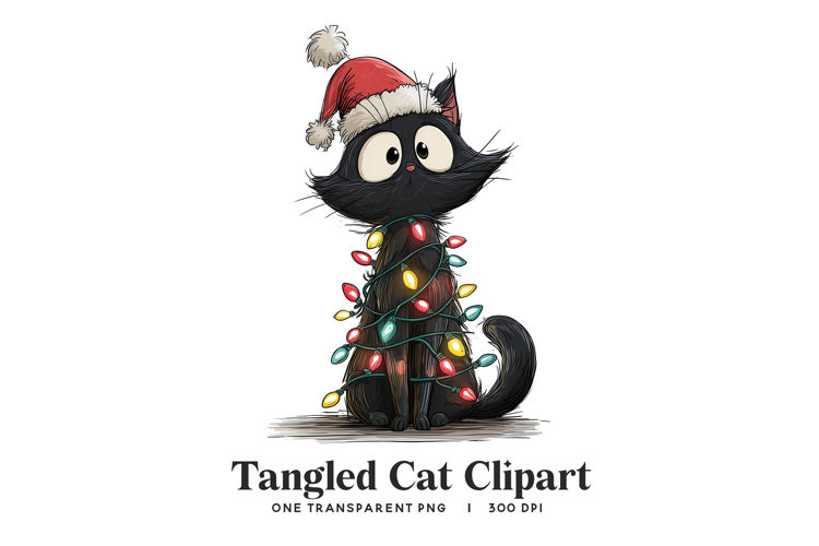 Acquire this charming and highly relatable graphic asset: the Tangled Cat Clipart PNG. This high-resolution, 300 DPI illustration captures a moment of typical feline holiday mischief, showing a wide-eyed black kitten wrapped up in colorful string lights and donning a Santa hat. Provided as a single, large, transparent background PNG, this file is perfect for creating best-selling sublimation products, digital crafts, funny greeting cards, and T-shirt designs. It's an invaluable, ready-to-use resource for seasonal products targeting pet owners and humor niches.