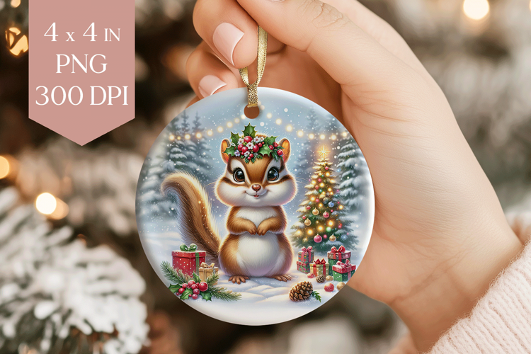 Cute Animal Sublimation Christmas Squirrel Woodland Creature Graphic Digital Art Resource Round Sublimation File Holiday Keepsake Art Easy To Use Png Christmas Chipmunk Png Chipmunk Ornament Design Holly Wreath Chipmunk