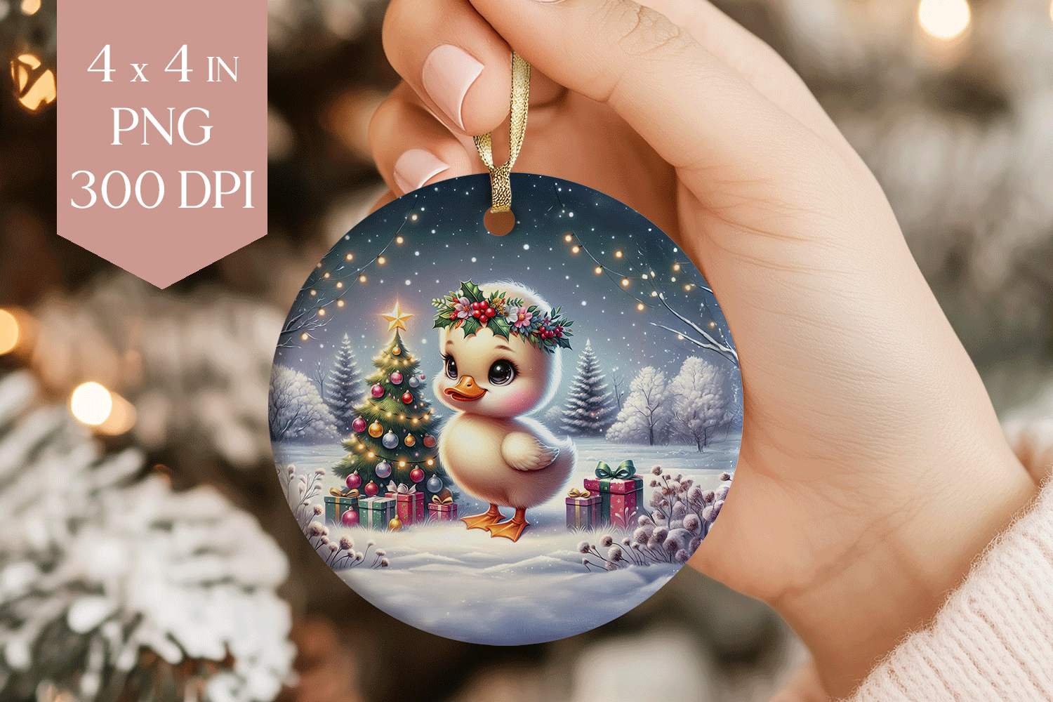 Elevate your holiday craft projects with this enchanting Christmas Baby Duck Sublimation PNG, an ideal resource for creating adorable circular ornaments. This high-resolution 4x4 inch image features a charming duckling wearing a festive floral wreath, standing amongst wrapped gifts next to a decorated Christmas tree in a whimsical, snowy landscape. This delightful digital art is perfectly sized and optimized for seamless transfer onto round sublimation blanks. The file's superior quality guarantees smooth transfers and brilliant, vibrant colors, allowing you to craft professional-quality seasonal decorations with ease.