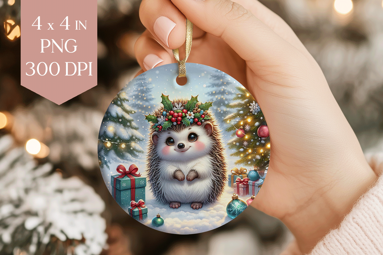 Christmas Animal Cute Animal Sublimation Woodland Creature Graphic Christmas Hedgehog Png Digital Art Resource Round Sublimation File Holiday Keepsake Art Easy To Use Png Hedgehog Ornament Design Holly Wreath Hedgehog