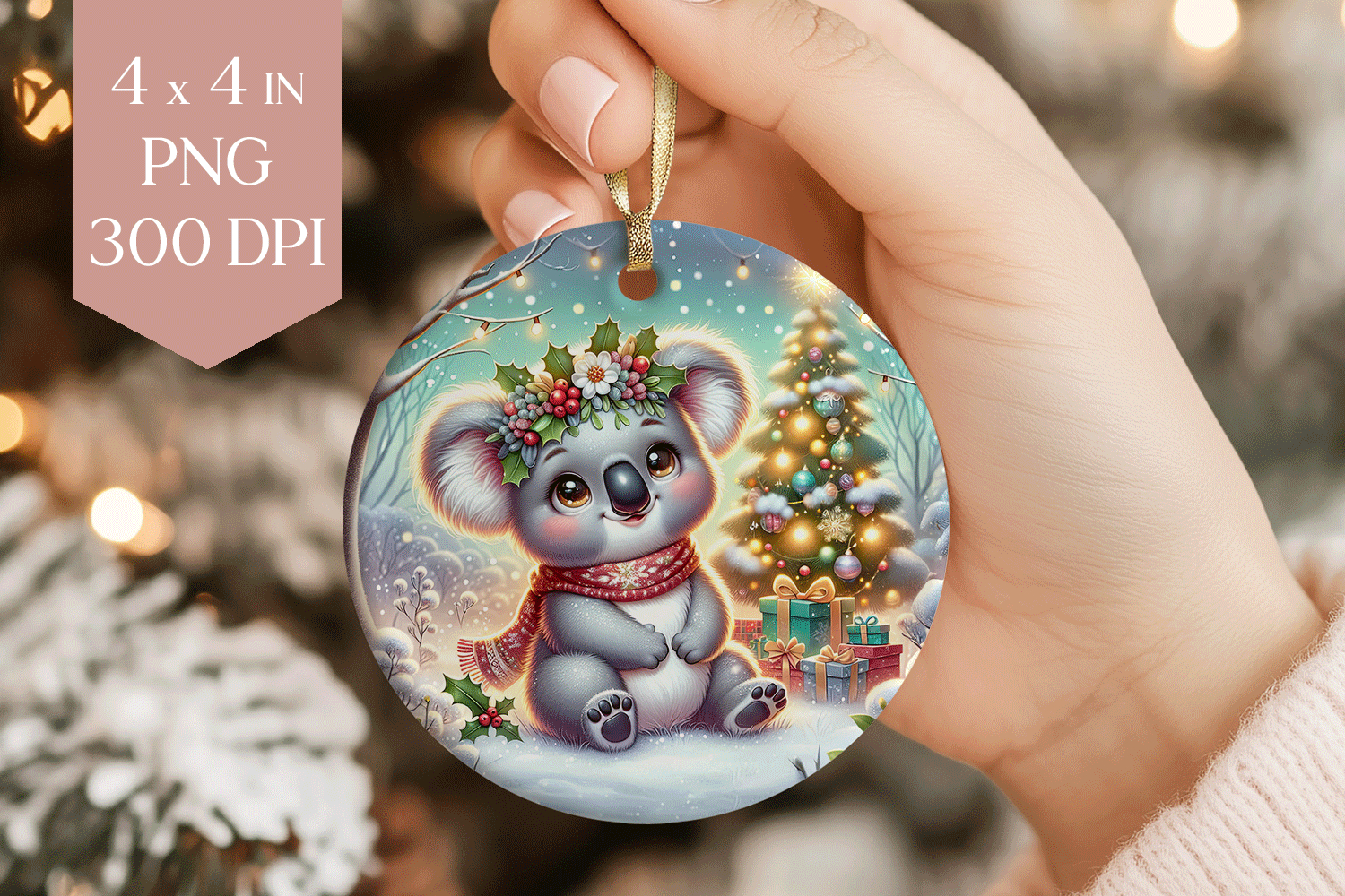 Infuse your holiday craft projects with a charming woodland element using this delightful Christmas Koala Sublimation PNG, an ideal resource for creating adorable circular ornaments. This high-resolution image showcases a sweet koala wearing a cozy scarf and holly wreath, seated in a beautiful snowy scene with a decorated Christmas tree. This lovely digital art is perfectly sized and optimized for seamless transfer onto round sublimation blanks. The file's superior quality guarantees smooth transfers and brilliant, vibrant colors, making it a fantastic asset for seasonal decoration creation.