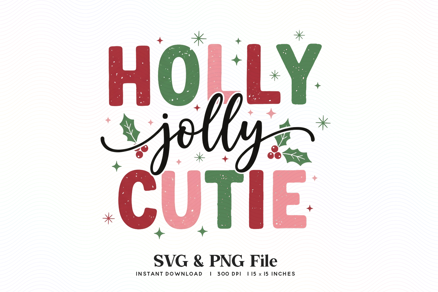 Offer a premium digital asset bundle with this captivating "Holly Jolly Cutie" SVG and PNG set, optimally formatted for both large-format sublimation printing and layered projects using electronic cutters. This high-quality 300 DPI design features a bold, distressed typeface combined with a flowing script and festive holly accents, suitable for apparel, home goods, and vinyl transfers. This versatile graphic provides makers with a trendy, ready-to-use resource for crafting high-value items, capitalizing on the popularity of retro and cute seasonal sayings for little girls and teens.