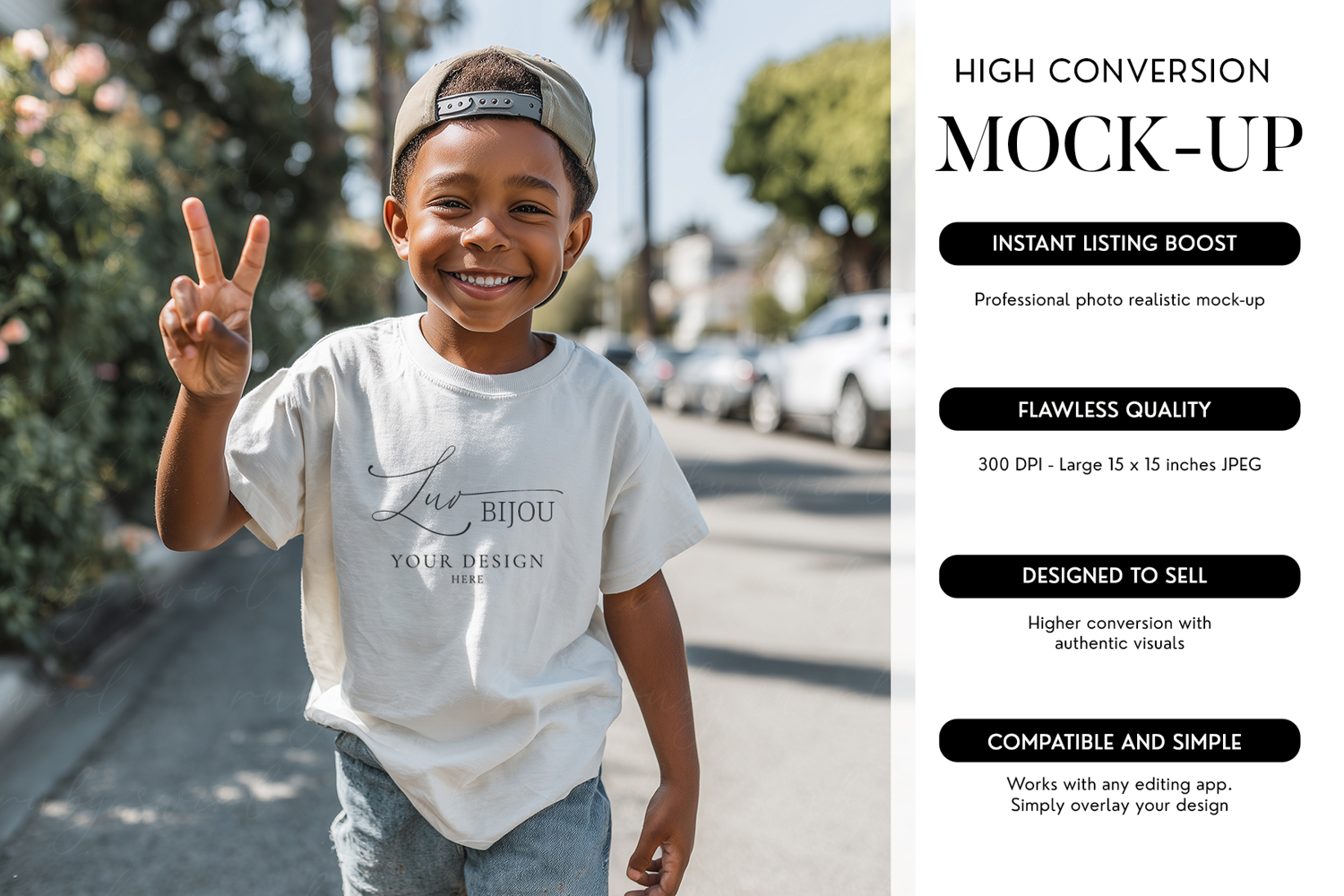 This premium Black Boy T-Shirt Mockup provides creators with an excellent, high-quality solution for showcasing apparel designs for a diverse customer base. The detailed 15x15 inch JPG captures an urban, sunny scene featuring the African American youth model in a blank, natural-colored T-shirt, offering a compelling and realistic presentation for any sublimation or cutting file graphic. This file is ready for simple design overlay in any editing program, making it an indispensable apparel digital template for designers and shops targeting a wide range of markets.