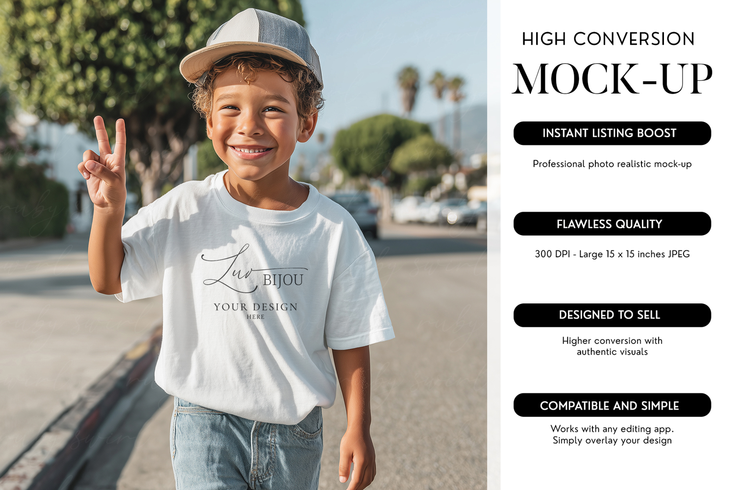 This premium Boy T-Shirt Mockup provides creators with a versatile, high-quality solution for showcasing designs with a trendy, outdoor aesthetic. The detailed 15x15 inch JPG captures a dynamic urban scene featuring a smiling child in a blank white T-shirt, offering a compelling and realistic presentation for any graphic or text. This digital template is ready for simple design overlay in any editing program, making it an indispensable tool for designers and shops targeting the youth apparel market who need high-converting, professional visuals.
