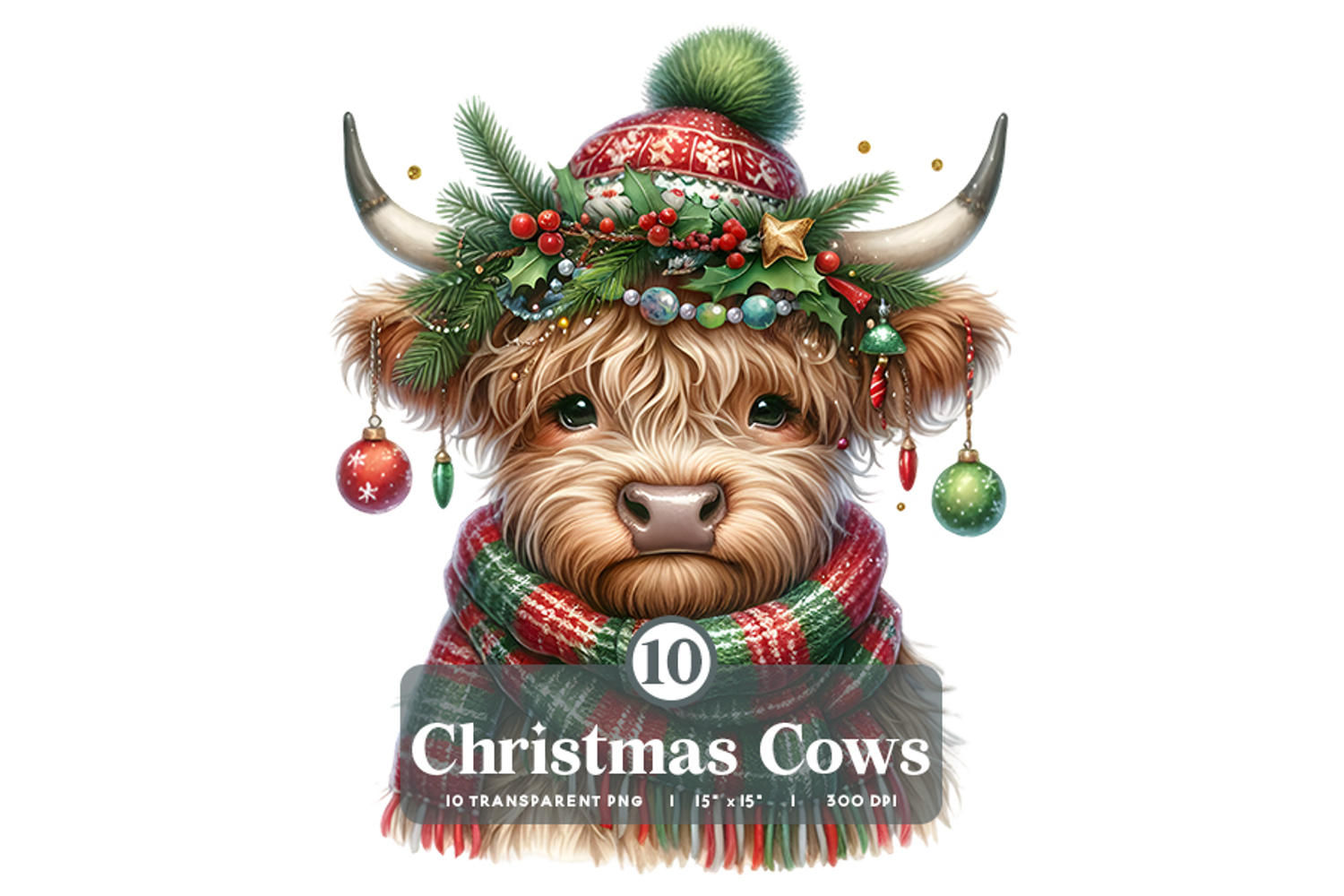 Maximize your crafting potential this holiday season with this exclusive 10-piece transparent PNG bundle of Christmas Highland Cattle. Each highly detailed and high-resolution image (300 DPI) features the popular shaggy cow wearing unique holiday accessories, such as ornaments, fair isle knits, and holly wreaths. This collection is ideal for creating custom-printed fabric, seasonal home decor projects, digital scrapbooking pages, and greeting card sets, providing excellent value and versatility for all your winter-themed merchandise and creative outputs. Simply download and start designing.