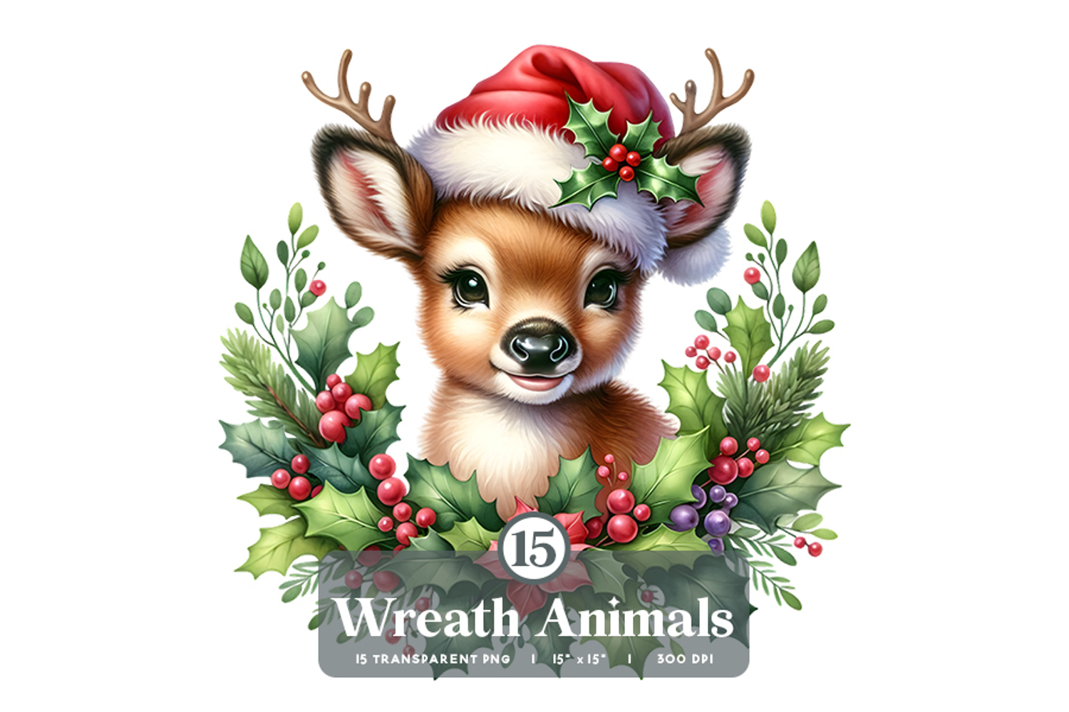 Similar Design Products to 15 Christmas Wreath Animal PNG Bundle 300 DPI Holly Pine