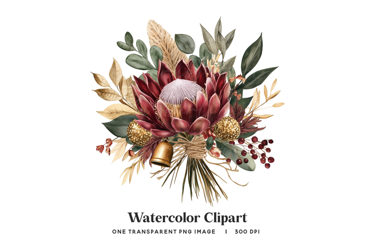 Rustic Christmas Png Dried Flower Bouquet High-resolution Clipart Protea Floral Graphic Boho Winter Design Gold Accent Illustration Unique Floral Composition Deep Red Protea Art Winter Wedding Asset Specialized Design Element