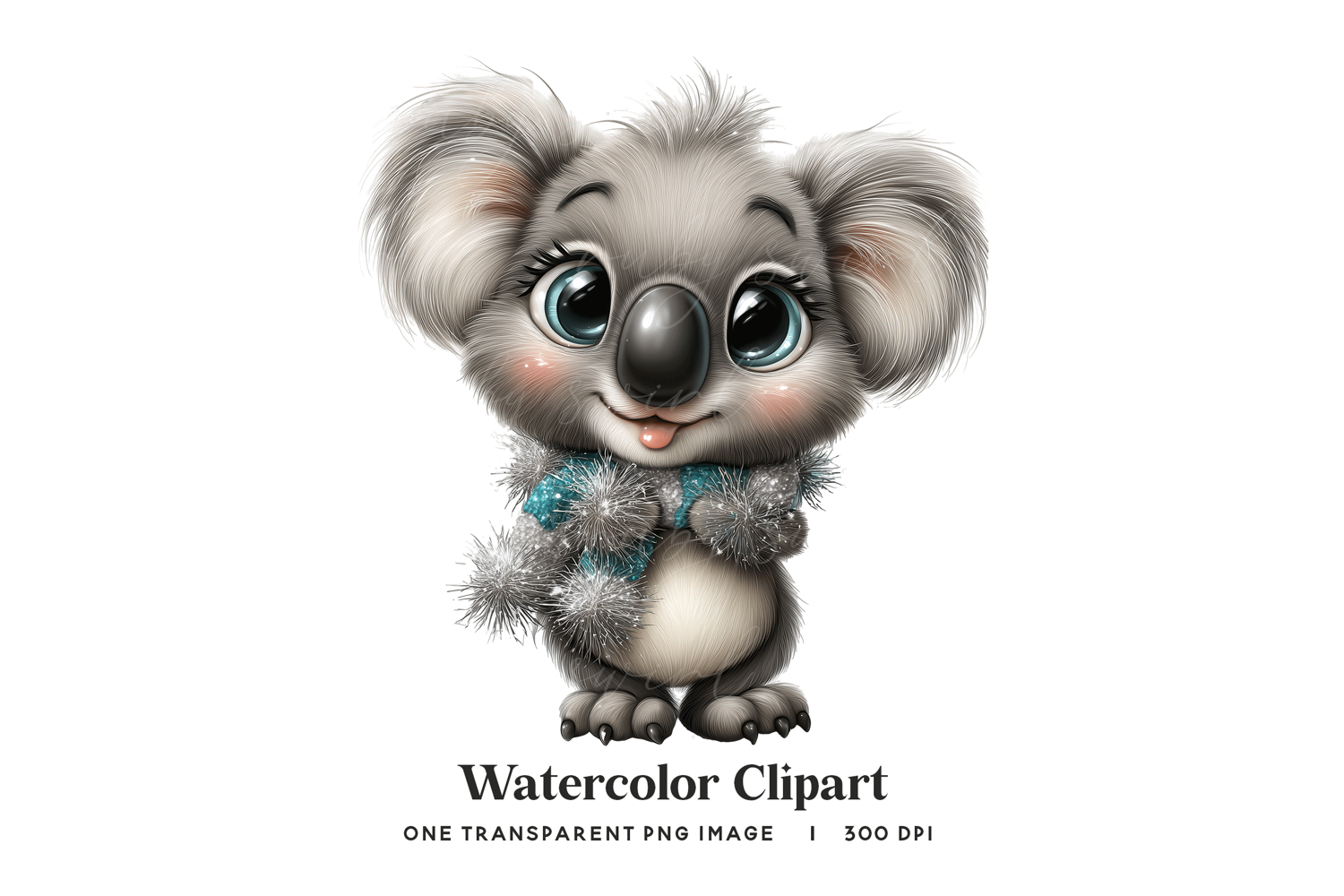 This sweet koala is wrapped in sparkling silver tinsel with a soft teal scarf, illustrated in a gentle watercolor style with expressive details. The high-resolution transparent PNG is ideal for holiday crafts, winter cards, themed decor, sticker sheets, sublimation projects, and festive digital artwork. Its cheerful expression and shimmering accents add a playful seasonal touch to any design.
