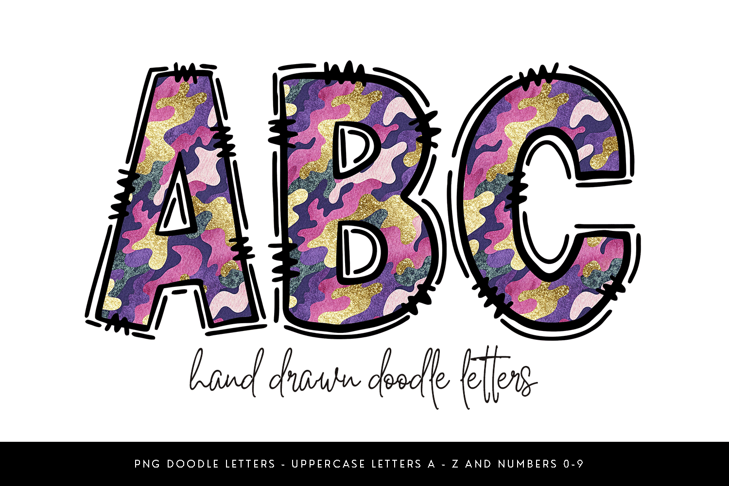 This camo alpha doodle pack includes A–Z letters and numbers 0–9, each designed with bold hand-drawn outlines and a vibrant camo pattern for eye-catching creative projects. Every letter is supplied as a transparent PNG with clean edges and rich detailing, perfect for stickers, apparel designs, labels, posters, scrapbooking, digital layouts and personalised lettering crafts.