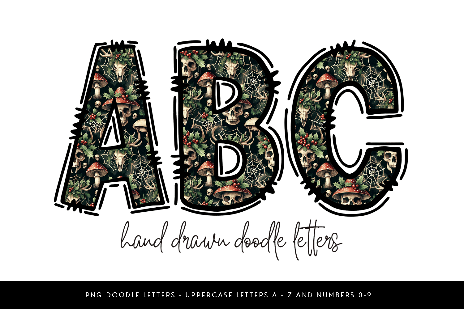 This gothic Christmas alpha doodle set includes A–Z and numbers 0–9, each illustrated with hand-drawn outlines and filled with a dramatic pattern of skulls, holly, mushrooms, webs, and rich winter tones. Delivered as high-resolution transparent PNGs, this alphabet is perfect for dark holiday crafts, alternative Christmas designs, stickers, apparel, branding, and unique seasonal projects.