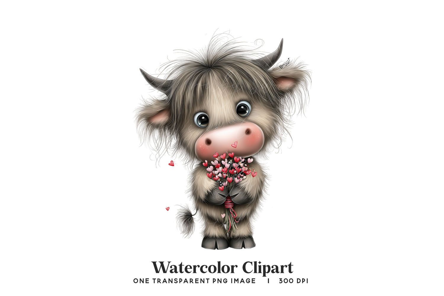 A soft, fluffy baby Highland cow holding a bouquet of tiny hearts—perfect for Valentine crafts, nursery prints, stationery, stickers, and cute sublimation designs that need a warm and heartfelt touch.