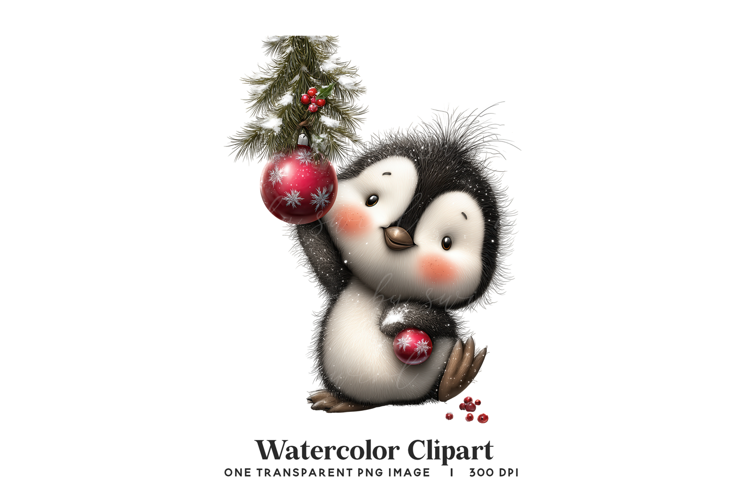 This festive watercolor-style penguin clipart features an adorable penguin holding a sparkling red Christmas ornament beneath a snowy pine branch. Delivered as a high-quality 300 DPI transparent PNG, it’s perfect for holiday cards, stickers, sublimation, Christmas crafts, winter décor, and festive scrapbooking. The soft textures and cute expression make it a standout addition to any seasonal project.