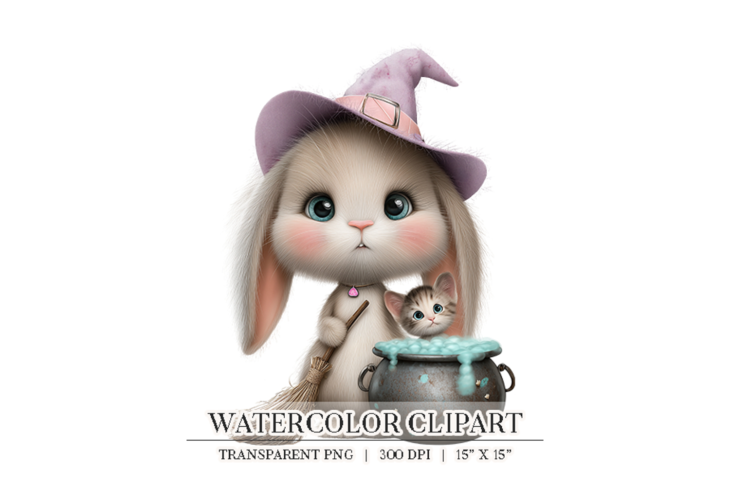 A soft watercolor-style witch bunny holding a broom beside a bubbling cauldron and tiny kitten — the perfect magical character for Halloween crafts, kids décor, party invitations, sublimation, and whimsical projects. The detailed textures and sweet expression add charm to spell books, trick-or-treat bags, stickers, and enchanting seasonal designs.