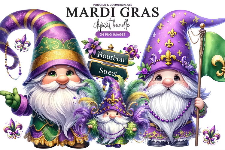 This vibrant Mardi Gras gnome clipart bundle includes 34 high-quality PNG illustrations featuring festive gnomes, feathers, beads, fleur-de-lis accents, masks, balloons, Bourbon Street signs, and rich purple, green, and gold details. Each image is 300 DPI with a transparent background, making them perfect for party invitations, shirts, tumblers, posters, stickers, sublimation, crafting projects, and digital designs. These playful, detailed characters bring the joyful spirit of Mardi Gras to any creative project.