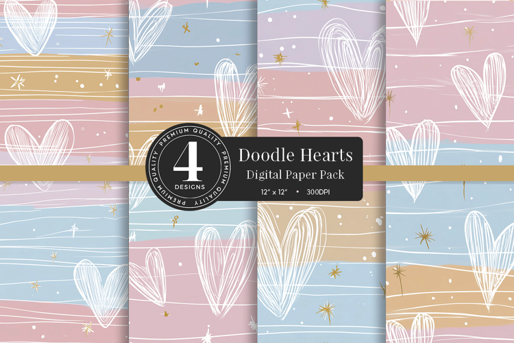 This doodle hearts digital paper pack features playful hand-drawn hearts layered over soft pastel stripes with subtle gold accents for a fun, whimsical, and modern look. Designed at high resolution in seamless 12x12 format, these papers are perfect for scrapbooking, card making, planners, printables, invitations, kids designs, Valentine’s projects, and creative digital work. The lighthearted doodle style pairs beautifully with soft blush, blue, and neutral tones, making this pack easy to mix and match within larger design bundles while still standing out as a cheerful, high-value addition to your creative library.