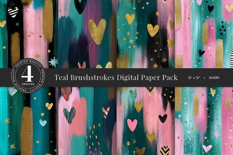 This Teal Brushstrokes Hearts Digital Paper Pack includes expressive abstract designs featuring layered brushstrokes, scattered hearts, and subtle gold-style accents in a rich teal and pink color palette. The painterly textures and playful heart details create a modern, artistic look that works beautifully for creative backgrounds, decorative layouts, and visually striking designs. Perfect for projects that call for bold color, texture, and a touch of romance.