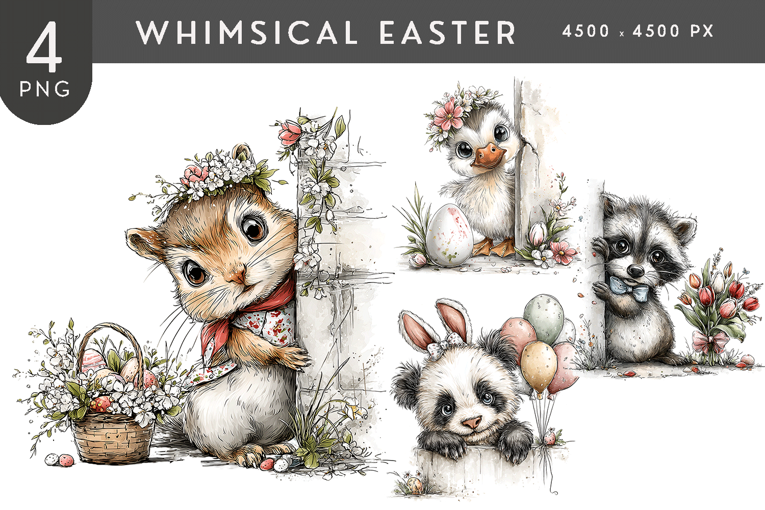This whimsical Easter illustration set features adorable woodland animals in a soft watercolor storybook style, including sweet forest critters peeking playfully around rustic walls and baskets, surrounded by pastel Easter eggs, florals, and gentle spring details. Each character is designed with expressive faces and cozy textures that create a warm, charming seasonal feel, making this artwork perfect for Easter crafts, greeting cards, stickers, sublimation designs, nursery art, wall décor, scrapbooking, invitations, and cheerful spring-themed creative projects.