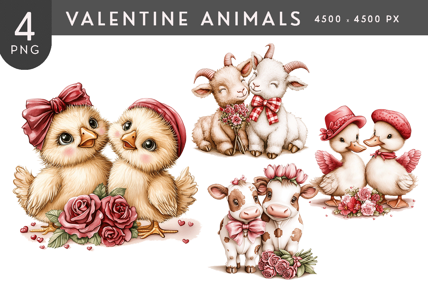 This sweet Valentine Animals watercolor set features adorable animal couples dressed in bows, hats, and floral accents, sharing affectionate moments surrounded by hearts and soft romantic details. With charming chicks, cuddly goats, loving calves, and playful ducklings illustrated in a gentle pastel watercolor style, this collection brings warmth and joy to any creative project. The hand-painted look and cozy Valentine theme make these illustrations ideal for cards, gifts, stickers, sublimation designs, apparel, nursery decor, invitations, planners, and seasonal artwork celebrating love, friendship, and togetherness.