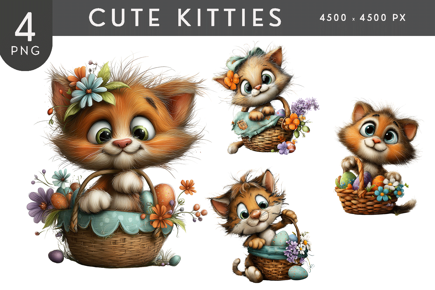 This adorable clipart set features four high-resolution kitten illustrations with big expressive eyes, fluffy textures, and charming basket details, perfect for adding a sweet and whimsical touch to creative projects. Designed in a soft storybook style, these PNG graphics are ideal for crafts, stickers, invitations, cards, digital designs, scrapbooking, children’s projects, seasonal artwork, and playful decor that celebrates cute characters and cozy charm.