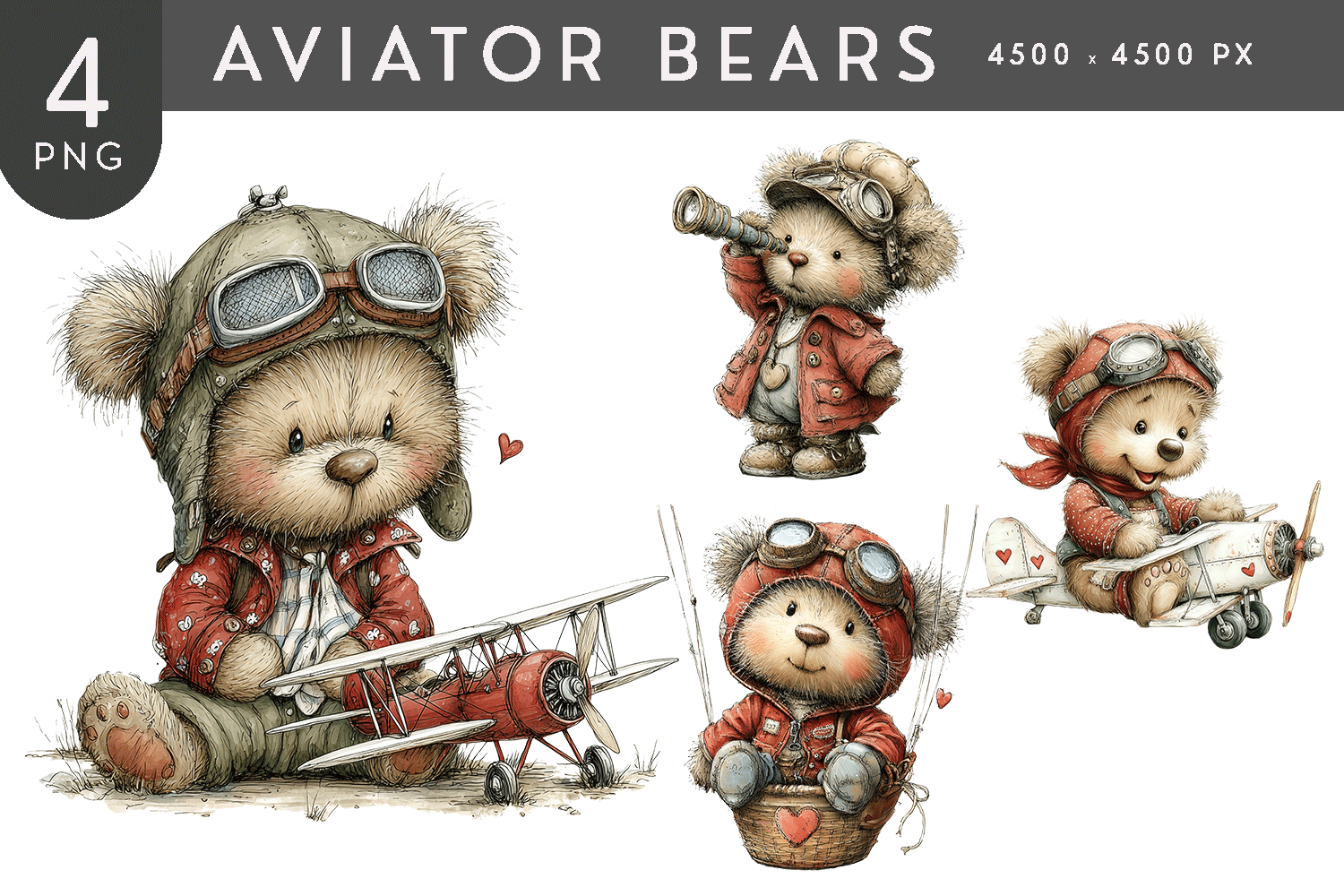 This adorable clipart set features four charming aviator bear illustrations in a soft vintage storybook style, showcasing teddy bears with goggles, planes, parachutes, binoculars, and whimsical flying details that spark imagination and adventure. Designed with warm textures and nostalgic character charm, these high resolution PNG graphics are perfect for children’s artwork, nursery designs, story illustrations, invitations, cards, stickers, scrapbooking, and creative digital projects that celebrate playful aviation themes and cozy illustrated art.