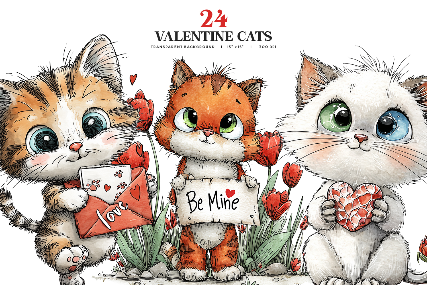This adorable clipart collection features twenty four hand illustrated Valentine themed cats with big expressive eyes, soft textures, hearts, flowers, and sweet love messages, all designed in a charming storybook style. Perfect for seasonal designs, cards, invitations, stickers, planners, scrapbooking, social graphics, and romantic creative projects, these high quality PNG illustrations add warmth, cuteness, and heartfelt charm to Valentine inspired artwork and playful designs.