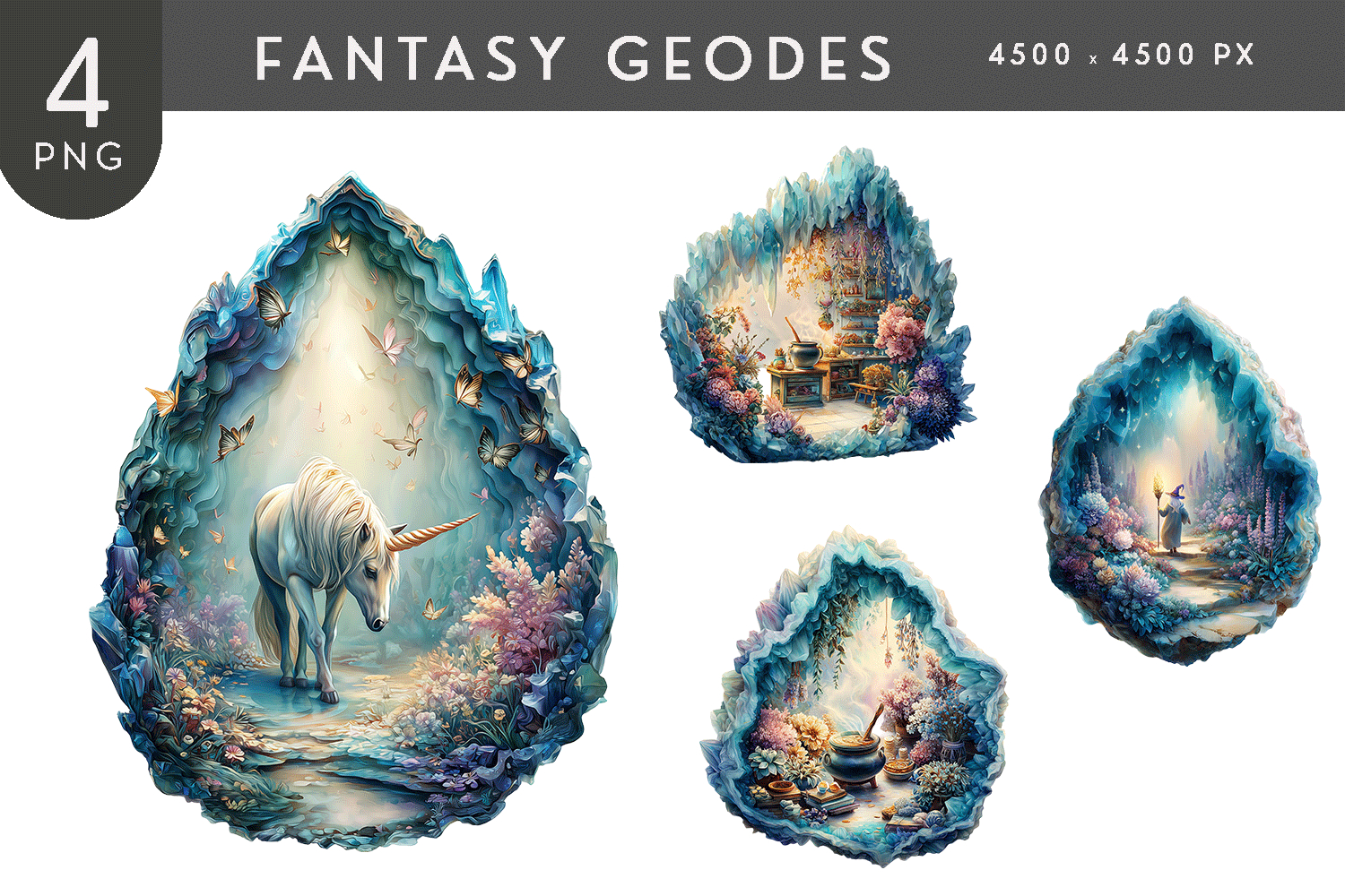 This fantasy geode clipart set includes four beautifully detailed crystal geodes, each opening into a magical inner realm. The scenes feature a serene unicorn sanctuary surrounded by butterflies, an enchanted potion workshop filled with flowers and glassware, a glowing wizard’s pathway illuminated by a staff of light, and a cozy magical nook with cauldrons and spell elements. Rendered in rich jewel-toned blues, soft pastels, and luminous highlights, these illustrations blend fairytale fantasy with crystal cave aesthetics, creating a dreamy, storybook atmosphere. Perfect for fantasy-themed designs, magical branding, book covers, journaling, scrapbooking, wall art, planners, stickers, and digital art projects that call for wonder, mystery, and enchantment.