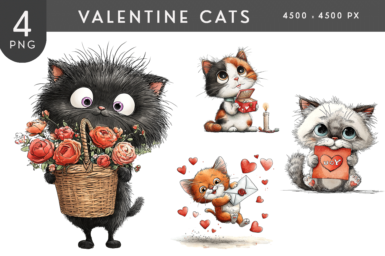 This adorable Valentine cat illustration bundle features four sweet kittens enjoying cozy, love-filled scenes with hearts, flowers, candles, and creative details. Illustrated in a soft watercolor style with charming expressions, this set is perfect for Valentine’s Day cards, planners, scrapbooks, stickers, invitations, and creative projects that focus on warmth, affection, and cuteness.