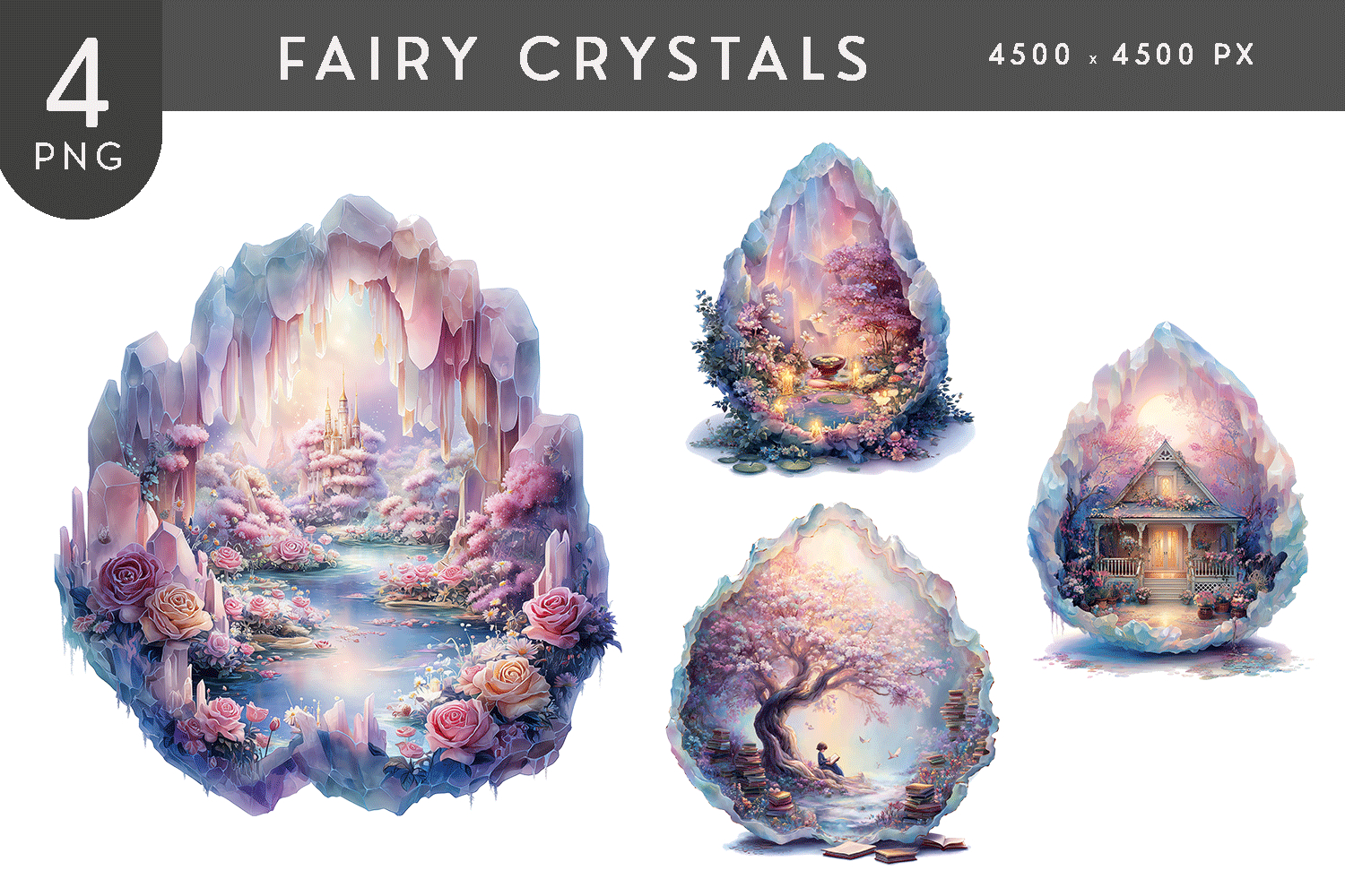This dreamy fantasy crystal scene bundle includes four soft-lit crystal illustrations revealing peaceful magical environments. Featuring fairytale lighting, lush botanicals, and serene fantasy settings, these designs are perfect for calming artwork, journals, wall decor, scrapbooks, and gentle fantasy-inspired creations.